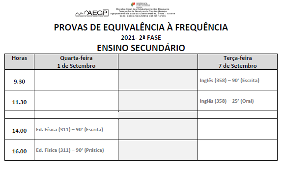 AEGP Calendário - 2º fase das Provas de Equivalência à Frequência 18/08/2021 - 18:21 Ficheiros Calendário - 2º fase das Provas de Equivalência à Frequência (112.21 KB) Artigos Relacionados Procedimento concursal para o cargo de Diretor(a) 28/04/26 Dia Nacional de Sensibilização Contra o Ciberbullying 27/04/26 Concurso - Técnicos Superiores e de Sistemas e Tecnologias de Informação 24/04/26