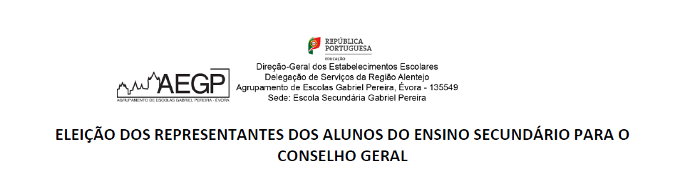 AEGP Eleição dos Representantes dos Alunos do Ensino Secundário para o Conselho Geral 22/10/2019 - 20:31 Ficheiros Nota Informativa - Eleição dos alunos (347.26 KB) Aviso de Abertura (90.01 KB) Artigos Relacionados Procedimento concursal para o cargo de Diretor(a) 28/04/26 Dia Nacional de Sensibilização Contra o Ciberbullying 27/04/26 Concurso - Técnicos Superiores e de Sistemas e Tecnologias de Informação 24/04/26