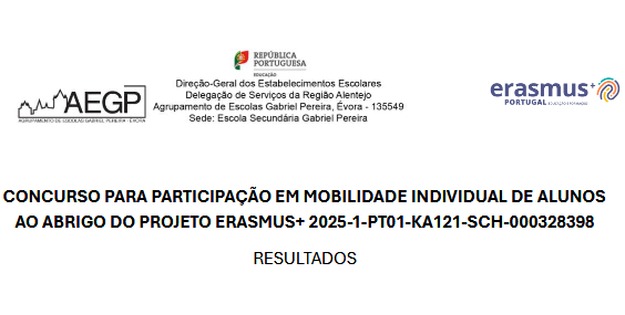AEGP ERASMUS - Resultado da Mobilidade Individual de Alunos 16/03/2026 - 10:50 Ficheiros Resultado da Mobilidade Individual de Alunos (325.76 KB) Artigos Relacionados Procedimento concursal para o cargo de Diretor(a) 28/04/26 Dia Nacional de Sensibilização Contra o Ciberbullying 27/04/26 Concurso - Técnicos Superiores e de Sistemas e Tecnologias de Informação 24/04/26
