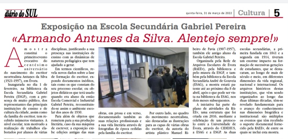 A exposição, que incide sobre a vida e a obra do escritor Antunes da Silva (Évora 1921-1997), no ano em que se assinala o centenário do seu nascimento, constitui o primeiro evento realizado em Évora no âmbito do ciclo comemorativo. A iniciativa tem suscitado grande interesse junto da comunidade, e dos órgãos de comunicação social, justificando-se a sua manutenção em cartaz.