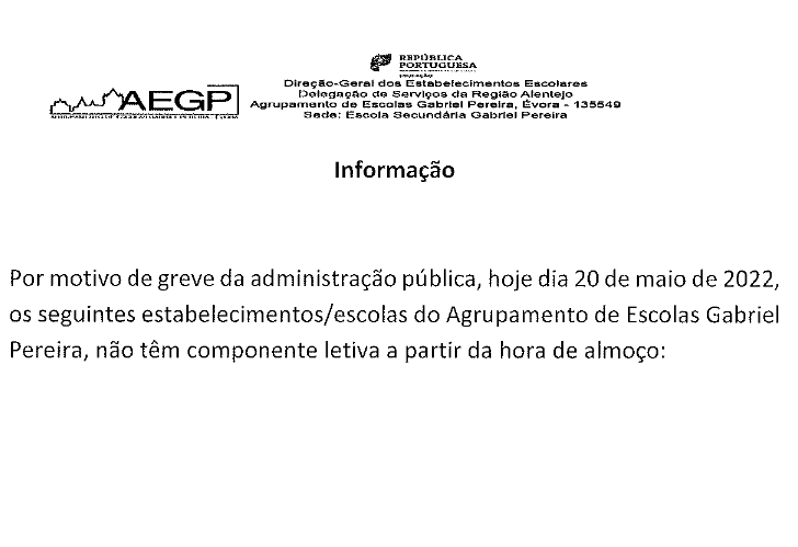 AEGP Informação - Greve 20/05/2022 - 10:15 Ficheiros Comunicado sobre a Greve (33.55 KB) Artigos Relacionados Procedimento concursal para o cargo de Diretor(a) 28/04/26 Dia Nacional de Sensibilização Contra o Ciberbullying 27/04/26 Concurso - Técnicos Superiores e de Sistemas e Tecnologias de Informação 24/04/26