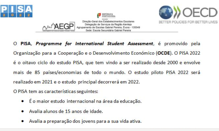 O teste de Pisa vão realizar-se no dia 30 de abril, os alunos devem estar às 8:30 no pavilhão A4 - salas de Informática.