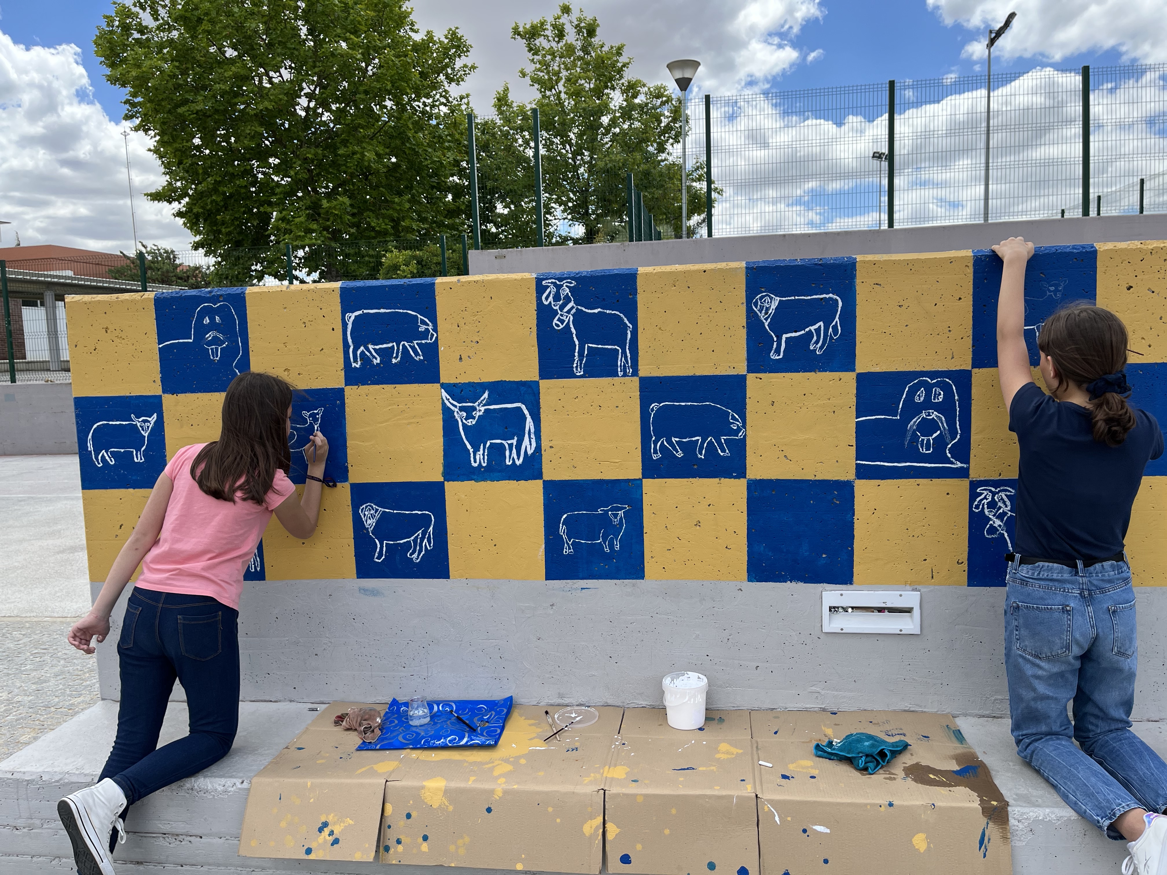 A pintura do muro teve como fonte de inspiração os painéis de azulejos, tradicionais na cultura portuguesa (painel em xadrez 30cm x 30cm). As cores escolhidas foram as dos rodapés das casas tradicionais do Alentejo, o amarelo e o azul. Nos quadrados azuis foram pintados os contornos a branco dos animais da região estudados. Os quadrados amarelos ficaram, propositadamente, por pintar, uma vez que no próximo ano letivo, os alunos do 6.º Ano vão dar continuidade a este projeto, desenvolvendo o tema da Flora da região, pelo que, neste momento, há intenção que a mesma venha a ser representada nesses quadrados.
