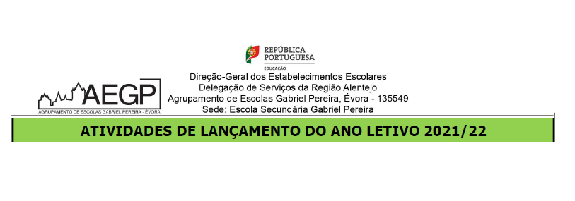 AEGP Atividades de Lançamento do ano letivo 21/22 - Alunos e Encarregados de Educação (Atualizado) 12/09/2021 - 22:31 Ficheiros Atividades de Lançamento do ano letivo 21/22 - Encarregados de Educação (339.05 KB) Atividades de Lançamento do ano letivo 21/22 - Alunos (397.41 KB) Artigos Relacionados Informação - Greve dia 17/04/2026 17/04/26 Alunos e aprendentes do AEGP em mobilidades Erasmus+ 14/04/26 Dádiva de Sangue - 5 de maio de 2026 - ESGP 13/04/26