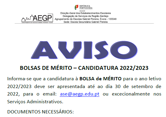 AEGP Bolsas de Mérito - Candidatura 2022/2023 28/07/2022 - 19:53 Ficheiros Bolsa de Mérito - Impresso (72.18 KB) Artigos Relacionados Informação - Greve dia 17/04/2026 17/04/26 Alunos e aprendentes do AEGP em mobilidades Erasmus+ 14/04/26 Dádiva de Sangue - 5 de maio de 2026 - ESGP 13/04/26