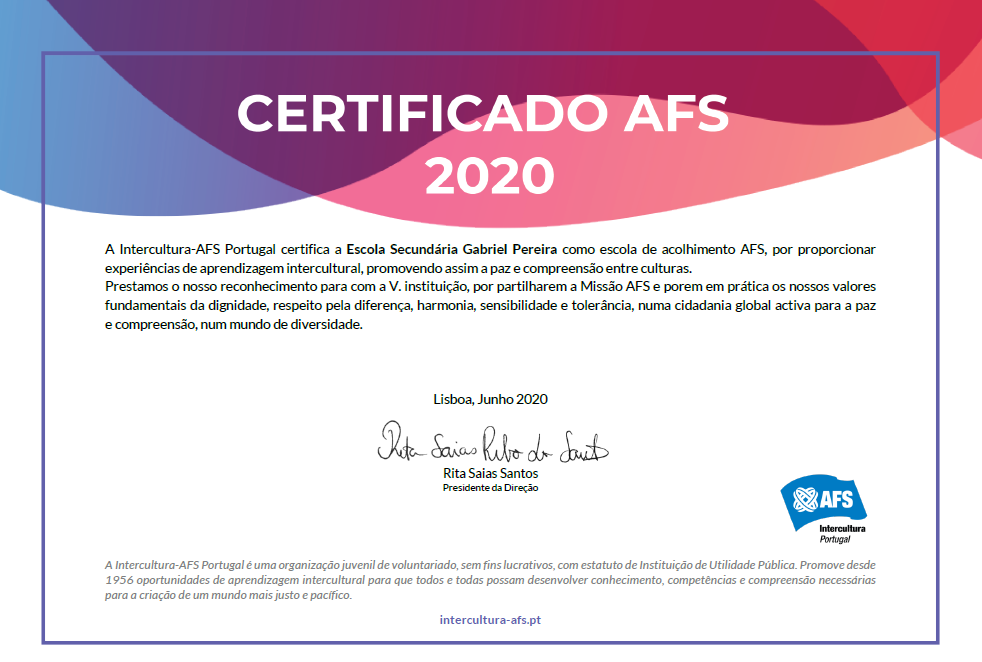 A Intercultura-AFS Portugal certifica a Escola Secundária Gabriel Pereira como escola de acolhimento AFS, por proporcionar experiências de aprendizagem intercultural, promovendo assim a paz e compreensão entre culturas.
