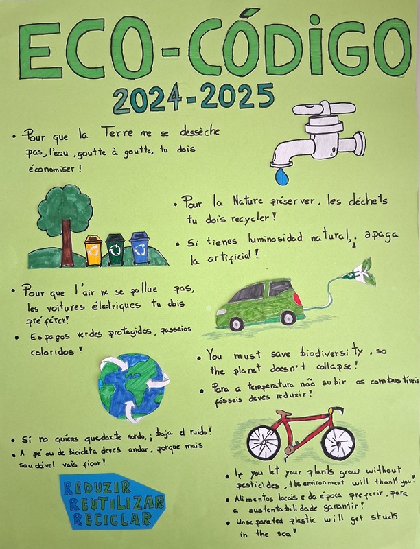 Com a elaboração do Póster Eco-Código 2024/2025 pretendeu-se identificar e divulgar um conjunto de atitudes e comportamentos conducentes à melhoria do ambiente na escola, em casa e na região. O trabalho foi iniciado através da definição da estratégia para a sua elaboração, uma articulação conjunta entre os coordenadores do Programa Eco-Escolas e a docente de Educação Visual. De seguida, a referida professora começou por sensibilizar os alunos com a apresentação de imagens e debates o que permitiu a aquisição de aprendizagens e os consciencializou para a temática. Foram lançadas várias ideias e abordados os temas-base (água, resíduos e energia), os tema do ano (espaços exteriores, biodiversidade e ação climática), assim como os temas complementares (transportes/mobilidade sustentável, agricultura biológica, alimentação saudável e sustentável, ruído, ar e mar.