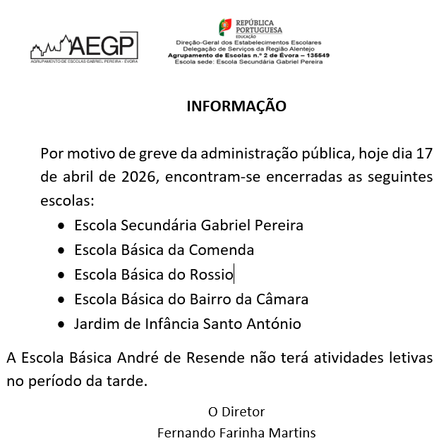AEGP Informação - Greve dia 17/04/2026 17/04/2026 - 10:27 Artigos Relacionados Alunos e aprendentes do AEGP em mobilidades Erasmus+ 14/04/26 Dádiva de Sangue - 5 de maio de 2026 - ESGP 13/04/26 Abertura do procedimento concursal para o cargo de Diretor(a) 08/04/26