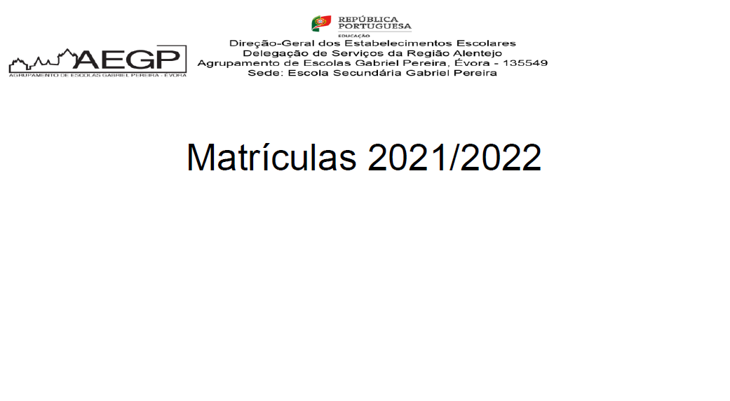 AEGP Matrículas 21/22 - Importante 15/06/2021 - 15:38 Ficheiros Matrículas para o ano letivo 2021/2022 (124.21 KB) Artigos Relacionados Informação - Greve dia 17/04/2026 17/04/26 Alunos e aprendentes do AEGP em mobilidades Erasmus+ 14/04/26 Dádiva de Sangue - 5 de maio de 2026 - ESGP 13/04/26