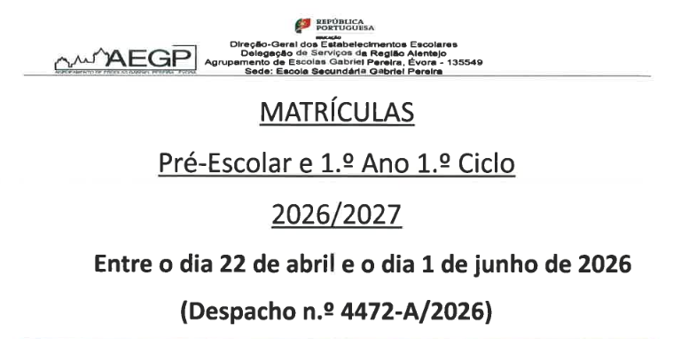 AEGP Matrículas no Pré-escolar e 1.º Ciclo 23/04/2026 - 16:38 Ficheiros Aviso de Abertura - Matrículas no Pré-escolar e 1.º Ciclo (184.23 KB) Artigos Relacionados Informação - Greve dia 17/04/2026 17/04/26 Alunos e aprendentes do AEGP em mobilidades Erasmus+ 14/04/26 Dádiva de Sangue - 5 de maio de 2026 - ESGP 13/04/26
