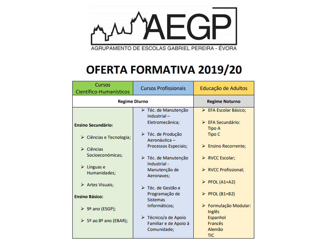 AEGP Oferta Formativa 2019/20 06/06/2019 - 11:54 Ficheiros Oferta Formativa 2019/20 (161.63 KB) Artigos Relacionados Informação - Greve dia 17/04/2026 17/04/26 Alunos e aprendentes do AEGP em mobilidades Erasmus+ 14/04/26 Dádiva de Sangue - 5 de maio de 2026 - ESGP 13/04/26