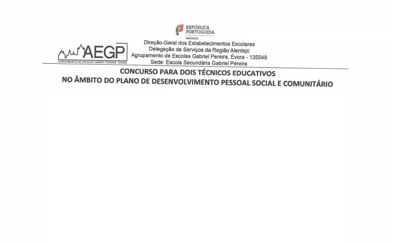 AEGP Resultado do Concurso para dois técnicos Educativos 28/09/2020 - 22:21 Ficheiros Horário 37 e 38 - Resultado do Concurso (609.78 KB) Artigos Relacionados Informação - Greve dia 17/04/2026 17/04/26 Alunos e aprendentes do AEGP em mobilidades Erasmus+ 14/04/26 Dádiva de Sangue - 5 de maio de 2026 - ESGP 13/04/26