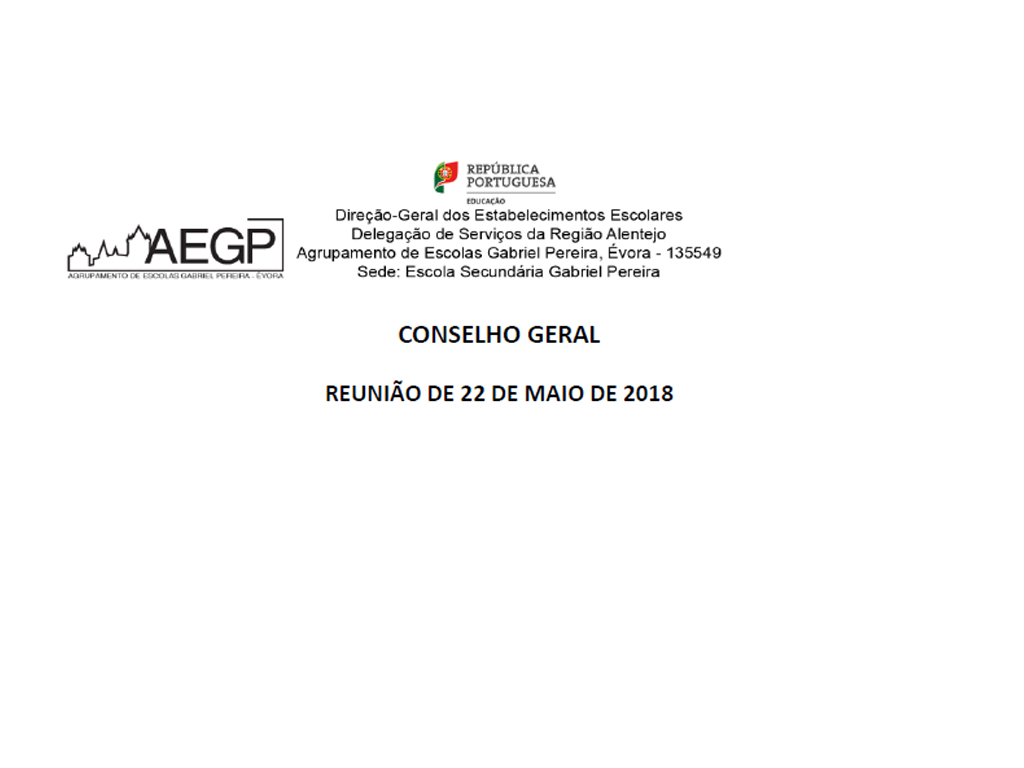 AEGP Torna-se pública a síntese da reunião do Conselho Geral de dia 22 de maio de 2018 25/05/2018 - 16:25 Ficheiros Informação nº 1 - Conselho Geral (512.39 KB) Artigos Relacionados Informação - Greve dia 17/04/2026 17/04/26 Alunos e aprendentes do AEGP em mobilidades Erasmus+ 14/04/26 Dádiva de Sangue - 5 de maio de 2026 - ESGP 13/04/26
