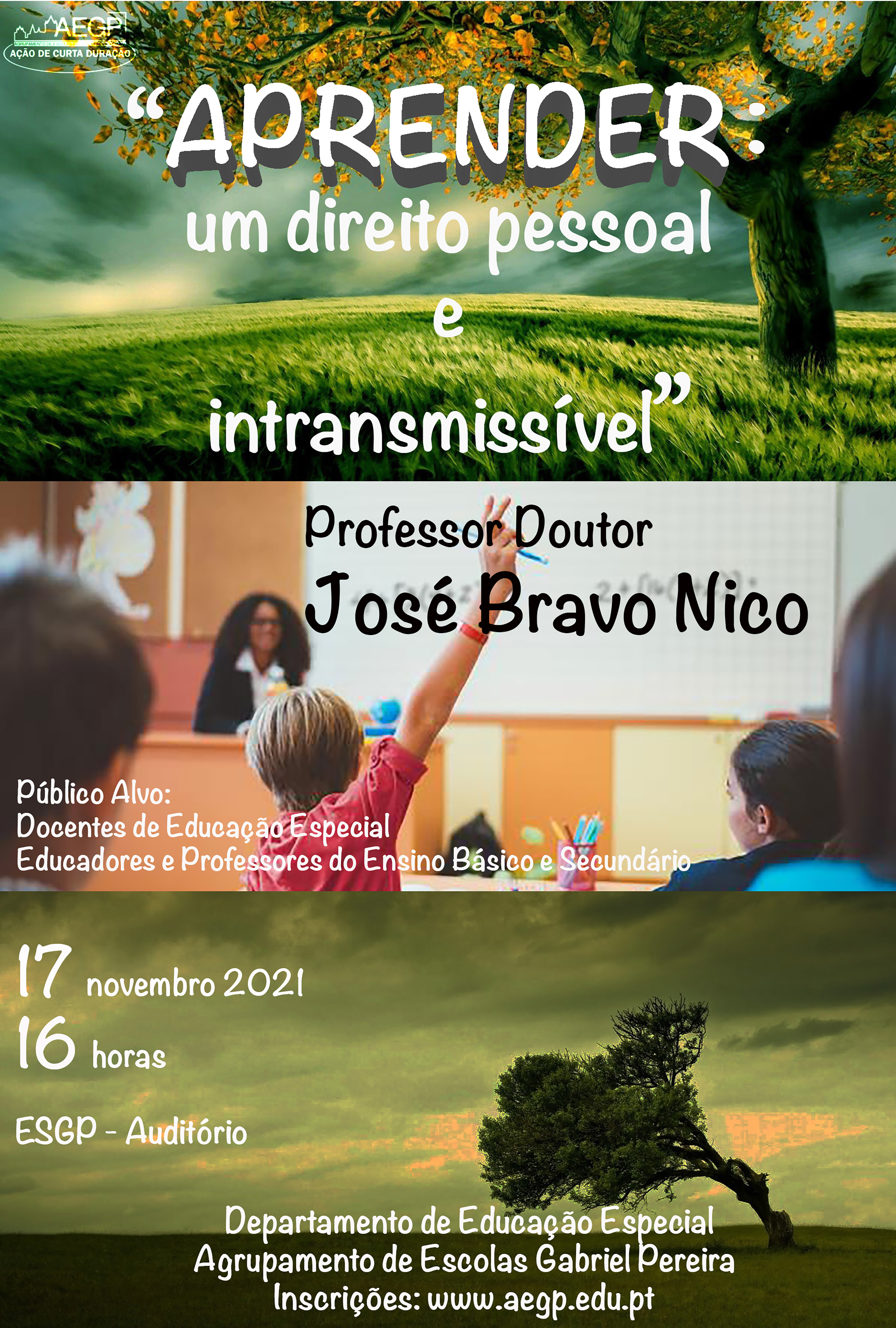 O Departamento de Educação Especial promove no dia 17 de novembro, pelas 16 horas no Auditório da Escola Gabriel Pereira, a realização da Ação de Formação de Curta Duração "Aprender: um direito pessoal e intransmissível", que terá como orador o Prof. Doutor Bravo Nico da Universidade de Évora. Esta ação trata do Direito à Educação como um dos pilares estruturantes das sociedades democráticas e uma dimensão fundamental para o exercício da cidadania