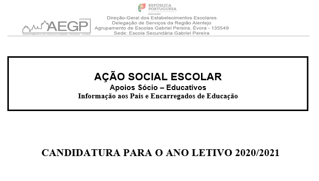 AEGP ASE - Candidatura para o ano letivo 20/21 27/05/2020 - 15:24 Ficheiros ASE - Candidatura (117 KB) Artigos Relacionados Candidatura aberta para mobilidade individual Erasmus+ 04/03/26 CTE Informática - O Alentejo ligado ao futuro 16/02/26 Inauguração do Centro Tecnológico Especializado - Informática 13/02/26