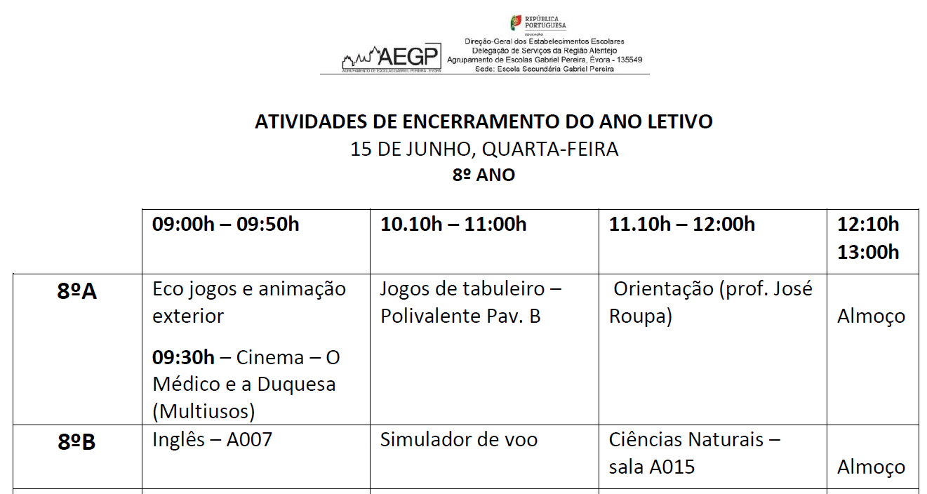AEGP Atividades de Encerramento do Ano Letivo - EBAR 14/06/2022 - 16:37 Ficheiros Atividades - 5º ano (122.61 KB) Atividades - 6º ano (123.77 KB) Atividades - 7º ano (126.97 KB) Atividades - 8º ano (130.17 KB) Artigos Relacionados Candidatura aberta para mobilidade individual Erasmus+ 04/03/26 CTE Informática - O Alentejo ligado ao futuro 16/02/26 Inauguração do Centro Tecnológico Especializado - Informática 13/02/26