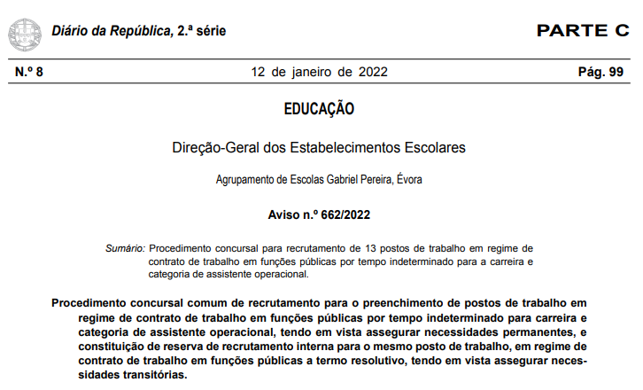 AEGP Aviso-662/2022 - Procedimento concursal para recrutamento de 13 postos de trabalho em regime de contrato de trabalho em funções públicas por tempo indeterminado 12/01/2022 - 18:04 Ficheiros Aviso-662/2022 (519.28 KB) Artigos Relacionados Candidatura aberta para mobilidade individual Erasmus+ 04/03/26 CTE Informática - O Alentejo ligado ao futuro 16/02/26 Inauguração do Centro Tecnológico Especializado - Informática 13/02/26