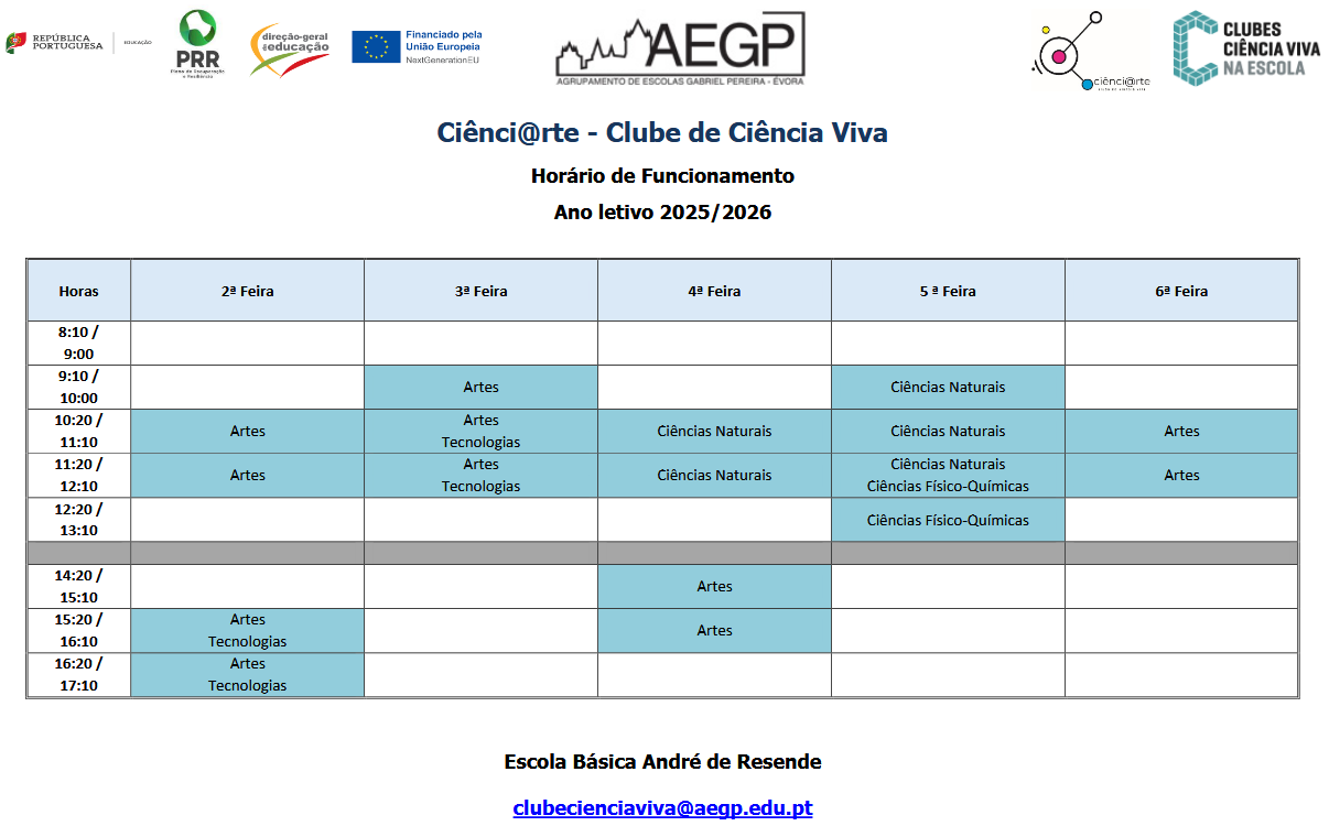 AEGP Clube de Ciência Viva - Ano letivo 25/26 29/10/2025 - 11:31 Ficheiros Atividades do Clube (242.02 KB) Artigos Relacionados Candidatura aberta para mobilidade individual Erasmus+ 04/03/26 CTE Informática - O Alentejo ligado ao futuro 16/02/26 Inauguração do Centro Tecnológico Especializado - Informática 13/02/26