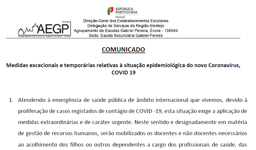 AEGP Comunicado - Medidas excecionais e temporárias relativas à situação epidemiológica do novo Coronavírus, COVID 19 15/03/2020 - 13:26 Ficheiros Medidas excecionais e temporárias relativas à situação epidemiológica do novo Coronavírus, COVID 19 (202.59 KB) Artigos Relacionados Candidatura aberta para mobilidade individual Erasmus+ 04/03/26 CTE Informática - O Alentejo ligado ao futuro 16/02/26 Inauguração do Centro Tecnológico Especializado - Informática 13/02/26