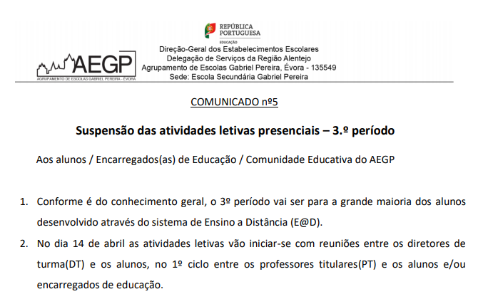 AEGP Comunicado - Suspensão das atividades letivas presenciais – 3.º período 11/04/2020 - 11:34 Ficheiros Comunicado nº 5 - Suspensão das Atividades Letivas Presenciais – 3.º período (175.02 KB) Artigos Relacionados Candidatura aberta para mobilidade individual Erasmus+ 04/03/26 CTE Informática - O Alentejo ligado ao futuro 16/02/26 Inauguração do Centro Tecnológico Especializado - Informática 13/02/26
