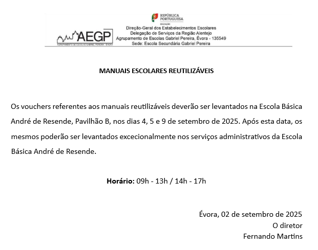 AEGP Manuais Escolares Reutilizáveis - ano letivo 25/26 02/09/2025 - 11:17 Ficheiros Informação - Manuais Escolares 25/26 (111.4 KB) Artigos Relacionados Candidatura aberta para mobilidade individual Erasmus+ 04/03/26 CTE Informática - O Alentejo ligado ao futuro 16/02/26 Inauguração do Centro Tecnológico Especializado - Informática 13/02/26