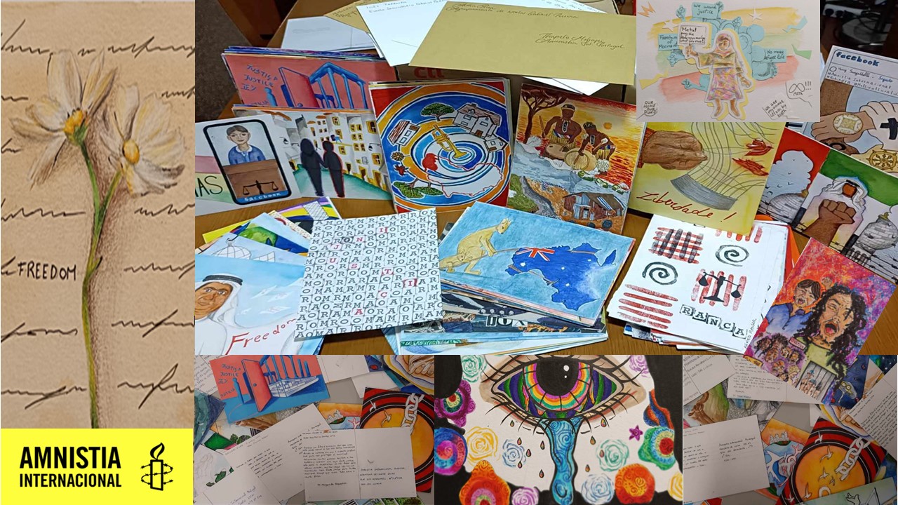 No âmbito da Cidadania e Desenvolvimento e do Projeto Cultural de Escola, os alunos das turmas 9º A, C, D, E, F (Educação Visual), 10º G (Desenho A), 11º G e H (Desenho A), 12º I e H (Oficina de Artes) e 12º F e G (Inglês) e as  professoras Paula Marques, Leonor Serpa Branco, Maria João Machado, Ana Teresa Sousa e Elisa Simão  juntaram-se à Amnistia Internacional, no evento Maratona de Cartas 2023/2024, através da realização de postais ilustrados  e cartas em inglês que serão entregues aos cinco ativistas e comunidades selecionados este ano letivo, por esta instituição. Após conhecerem a história de cada um dos casos, os alunos escolheram o ativista e a causa que maior interesse lhes despertou. Ao participarem com os seus postais ilustrados e respetivas mensagens naquele que é considerado o maior evento de direitos humanos, estes alunos dão mais um passo na sua formação enquanto cidadãos solidários, participativos e ativistas dos Direitos Humanos.