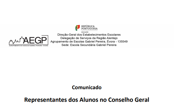 AEGP Representante dos Alunos no Conselho Geral 15/12/2020 - 21:35 Ficheiros Resultados Eleitorais - Representantes dos Alunos no Conselho Geral (82.99 KB) Artigos Relacionados Candidatura aberta para mobilidade individual Erasmus+ 04/03/26 CTE Informática - O Alentejo ligado ao futuro 16/02/26 Inauguração do Centro Tecnológico Especializado - Informática 13/02/26